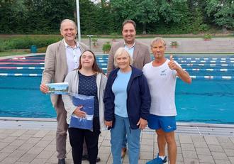 Die 100.000. Besucherin des Freizeitbads Roth, Christine Becker (2. Von links, mit ihrer Mutter) wurde am 11. September von Werkleiter Dr. Brunner, Bürgermeister Andreas Buckreus und Badbetriebsleiter Matthias Schubert begrüßt (von links).