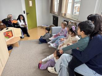 Sabina Loch (Stadtbücherei) und die ehrenamtliche Vorleserin Semra Coban Steyer lesen den Kindern der Kita Villa Wirbelwind zweisprachige Geschichten vor.