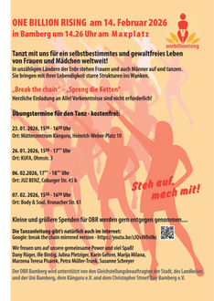 „One Billion Rising“ ist ein weltweiter Aktionstag für ein Ende der Gewalt an Frauen und Mädchen, für weltweite Solidarität und gegen Unterdrückung und Ausbeutung. Am 14. Februar 2026 um 14:26 Uhr tanzen auch in Bamberg wieder Frauen, Jugendliche und solidarische Männer auf dem Maxplatz für ein selbstbestimmtes und gewaltfreies Leben von Frauen und Mädchen überall auf der Erde.