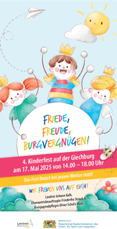 Die Idee für ein Kinderfest auf der Giechburg kam vor einigen Jahren aus den Reihen der Ehrenamtlichen. Aufgrund des tollen Erfolgs der vergangenen Kinderfeste haben Ehrenamtsbeauftragte Friederike Straub und Kreisjugendpfleger Oliver Schulz-Mayr auch in diesem Jahr wieder ein Fest für große und noch nicht ganz so große Kinder auf die Beine gestellt. Durch die Förderung des Bayerischen Staatsministeriums des Innern, für Sport und Integration sowie in Kooperation mit der Bayerischen Sportjugend, dem Kreisjugendring Bamberg-Land, KoBis, der Kommunalen Jugendarbeit des Landkreises Bamberg und der VR Bank Bamberg-Forchheim und die großartige Unterstützung ehrenamtlicher Vereine wartet das Fest auch in diesem Jahr wieder mit eine abwechslungsreichen Programm auf.