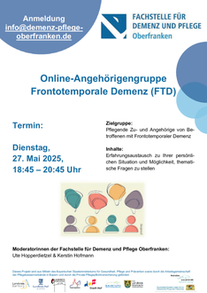 Am Dienstag, 27. Mai 2025 von 18.45 bis 20.45 Uhr lädt die Fachstelle für Demenz und Pflege Oberfranken An- und Zugehörige von Menschen mit Frontotemporaler Demenz (FTD) zur Online-Gesprächsgruppe in Oberfranken ein. FTD ist die zweithäufigste Form bei an Demenz erkrankten Menschen unter 65 Jahren. Das Absterben von Nervenzellen vor allem im Stirn- und Schläfenbereich des Gehirns kann zu starken Veränderungen des emotionalen Erlebens und Sozialverhaltens oder der Sprache führen. Aufgrund der Wesensveränderung ist die Erkrankung eine Herausforderung für die gesamte Familie. Die Gesprächsgruppe dient vorrangig dem gegenseitigen Austausch und der Unterstützung. Wer teilnehmen möchte, kann sich telefonisch unter 09281/57-500 oder per E-Mail an info@demenz-pflege-oberfranken.de anmelden.