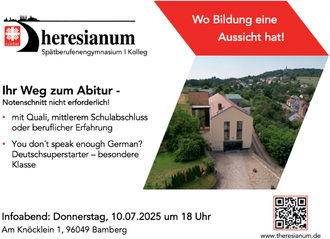 Am Donnerstag, 10. Juli 2025, 18.00 Uhr, findet ein Informationsabend im Bamberger Theresianum statt. Die beiden Schularten Spätberufenengymnasium und Kolleg bieten eine echte Alternative für junge Menschen, die nach dem Quali bzw. dem mittleren Schulabschluss oder nach einer beruflichen Ausbildung die „Allgemeine Hochschulreife“ (Abitur) in drei bzw. vier Jahren erreichen wollen. Im Schuljahr 2025/26 bieten wir erstmal auch eine „besondere Klasse“ für Deutsch als Zweitsprache an.