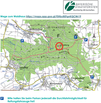 Das Fest am Waldhaus Geisberg https://maps.app.goo.gl/FjHbyBEFgnKQCWr19 ist ausgeschildert von Geisfeld, Teuchatz, Melkendorf und Lindach. Es ist von öffentlichen Straßen nur zu Fuß oder mit dem Fahrrad zu erreichen!