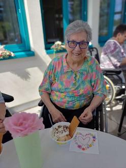 Bei bestem Wetter und draußen auf der Terrasse sitzend, genossen die Seniorinnen und Senioren Vanille-, Erdbeer- und Schokoeis, wahlweise mit Sahne oder ohne, mit Waffel und Schokostreusel. Den nicht gehfähigen Bewohner*innen brachten das Team ihre Eisbecher persönlich aufs Zimmer.