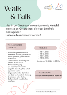 Durch „Walk & Talk“ wird Interessierten eine unverbindliche Möglichkeit geboten, entspannt ins Gespräch zu kommen und neue Kontakte zu knüpfen, so die Organisatorinnen des Gesundheitsamts Bamberg sowie des Amts für Inklusion der Stadt Bamberg. Während der organisierten Spaziergänge können die Teilnehmenden neue Leute kennenlernen, bereichernde Gespräche führen und dabei auch noch an der frischen Luft sein. Die Initiative basiert auf der erfolgreichen Idee der Selbsthilfe Bayern (SEKO Bayern e. V.).