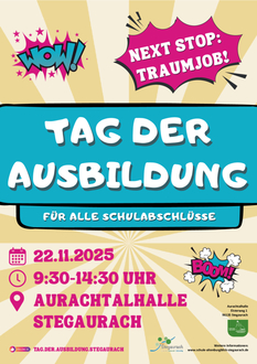 Die Schule Altenburgblick und die Gemeinde Stegaurach veranstalten auch in diesem Jahr wieder einen Tag der Ausbildung am Samstag, 22.11.25 von 9.30 - 14.30 Uhr in der Aurachtalhalle Stegaurach.