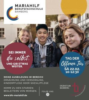 Am 22.02.25 findet von 10.00 Uhr bis 12.30 Uhr ein Tag der offenen Tür an der Berufsfachschule Mariahilf am Stephansplatz 2 in 96049 Bamberg statt. Zwischen 10.15 Uhr und 12.00 Uhr informieren wir gezielt zu den Ausbildungen in Sozialpflege, Ernährung und Versorgung und Kinderpflege. Des Weiteren können Interessentinnen und Interessenten einen Eindruck von Aktionen aus dem Schulalltag, den Schulräumen und unserer „anderen Lernwelt“ erhalten.