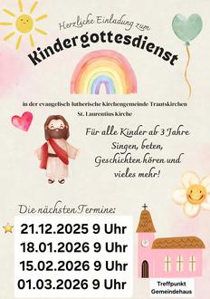 | 09:00 Uhr : | Gottesdienst, zeitgleich Kindergottesdienst |