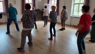 Martina Liebeton und Quartiersmanagerin Kerstin Müller laden gemeinsam mit dem Treffpunkt Alte Schule zum wöchentlichen Line-Dance-Kurs ein.