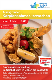 Ein besonderes Highlight in diesem Jahr ist die Eröffnung der 47. Aischgründer Karpfenschmeckerwochen im Gasthof Zum Stern in Linden am 27.08.2025 ab 17:00 Uhr zu der alle Feinschmecker herzlich eingeladen sind. Landrat Dr. Christian von Dobschütz und die Aischgründer Karpfenkönigin werden die Karpfensaison offiziell eröffnen. Es erwartet alle Karpfenliebhaber ein buntes Buffet vom Aischgründer Karpfen g.g.A zum Preis von 29,90€. Ein besonderes Highlight sind die Karpfenbratwürste, die nur zu besonderen Anlässen wie diesem verkostet werden können. Reservierungen und Anmeldungen unter 0160 1243070.