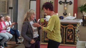 Bürgermeisterin Claudia Wust würdigte im Rahmen des Gottesdienstes Frau Thurm für ihr außergewöhnliches Engagement, ihre Geduld und ihr pädagogisches Gespür. Als bleibende Erinnerung erhielt Frau Thurm eine Birne, symbolisch für einen Baum, den sie in ihrem Garten pflanzen kann.