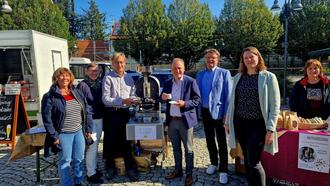 v.l.n.r.: Mitarbeiterinnen des Weltladens und Mitorganisatorinnen Ute Graske, Gertraud Roth, Erster Bürgermeister Klaus Förster, Thomas Ludwig (kommissarischer Wirtschaftsförderer) und Franziska Kolek (Nachhaltigkeitsbeauftragte) überzeugten sich bei einer Tasse frisch gerösteten Espressos selbst vom Können des Rösters Ralf Gebhard (3. von links)