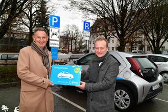Dank swa Carsharing gibt es flexible Mobilität ab sofort auch in Bobingen. swa Geschäftsbereichsleiter Multimobilität Jürgen Biedermann und Bobingens Erster Bürgermeister Klaus Förster (rechts im Bild) freuen sich über die Kooperation.