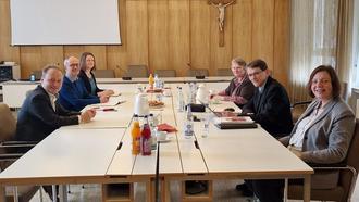 v.l.n.r.: Erster Bürgermeister Klaus Förster, Stadtbaumeister Rainer Thierbach, Nachhaltigkeitsmanagerin Dr. Franziska Kolek, Klimaschutzmanagerin Dr. Kerstin Koenig-Hoffmann, Auditor Leonard Meyer sowie Energieberaterin der eza! Heidi Schön beim Abschlussgespräch des internen eea-Zertifizierungsaudits.