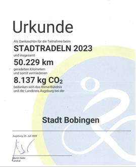 In Bobingen haben dieses Jahr 183 Radelnde teilgenommen, die in 10 Teams organisiert waren. Die Radler haben erstmals die 50.000 km-Marke geknackt und legten deutlich mehr Kilometer zurück als die Jahre zuvor. Dabei vermieden sie 8 t CO2. Zwei Teams („Kolpingsfamilie Bobingen“ und „Evangelisch in Bobingen“) haben dabei jeweils mehr als 15.000 km bzw. mehr als 12.000 km erradelt! Betrachtet man die meisten Kilometer pro Kopf so hatte ein Zweier-Team mit über 1.100 km pro Kopf die Nase vorn!