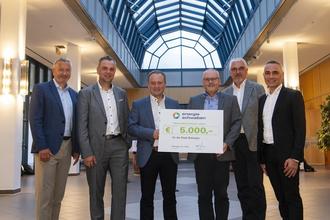 Im Rahmen der Feierlichkeiten zum 50-jährigen Jubiläum der Partnerschaft und Zusammenarbeit überreichte engerie schwaben eine Spende an die Stadt Bobingen. Von links nach rechts: Uwe Sommer (Geschäftsführer EVB Netze), Dirk Weimann (Geschäftsführer energie schwaben), Erster Bürgermeister Klaus Förster, Stadtkämmerer Stefan Thiele, Anselm Pfitzmaier (Geschäftsführer schwaben netz) und Nihat Anaç (Geschäftsführer schwaben netz)