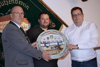 Der erste Schützenmeister Harald Mendler und der Schirmherr Bernd Hartmannschott übergeben die Einweihungsscheibe an den Gewinner Matthias Egerer