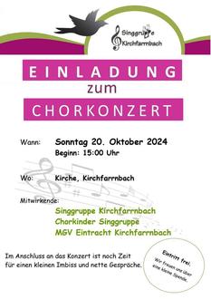 | 15.00 Uhr | Herzliche Einladung zum Chorkonzert in Kirchfarrnbach |