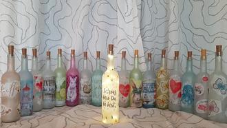 | Kosten: | € 25,- für die Gestaltung von zwei Flaschen (Flasche, Leuchtkorken, Servietten, Frostfarbe, Deko) |