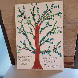 Nach der Geschichte konnte jedes Kind mit seinem Fingerabdruck ein Blatt auf unserem Zukunftsbaum hinterlassen. Die Leinwand steht inzwischen in der Bücherei, dort kann unser Zukunftsbäumchen bewundert werden.