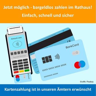Nutzen Sie die Möglichkeit der Kartenzahlung, z.B. um die Gebühren für Ihren Ausweis oder Reisepass zu begleichen. Auch alle anderen Dienstleistungen und Gebühren können im Rathaus nun einfach, schnell und sicher per Bankkarte bezahlt werden.