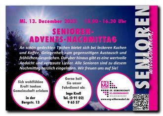 Alle älteren Menschen, die im Rahmen des Advents-Singens am 16. Dez. gerne einen Besuch wünschen, dürfen sich bei Susanne Zink, 09102 96832 melden.