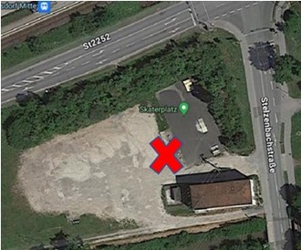 Der Standort des Sammelplatzes befindet sich an der Stelzenbachstraße am Trafohaus. (Kreuz im Bild)