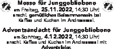| 14.30 Uhr | Hannberg | Adventsandacht Junggebliebene |