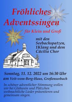 Gemeinsam mit den Seebachspatzen veranstaltet der Cäcilia Chor ein Fröhliches Adventssingen für Groß und Klein am 11.12.2022 vor dem Veit-vom-Berg-Haus und lädt herzlich dazu ein.