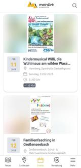 In der App finden Sie neben aktuellen Nachrichten aus den Gemeinden und der Verwaltung („Neues“) vor allem auch Veranstaltungen (Events). Tippen Sie diese an, öffnet sich eine Detailansicht mit weiterführenden Informationen. Sie können diese Events einfach per Fingertipp in Ihre Kalender-App auf dem Handy übernehmen oder mit andere teilen – egal, ob per Messenger Ihrer Wahl oder auch per E-Mail. Machen Sie so auch ihre Freunde und Nachbar auf interessante Veranstaltungen aufmerksam – und bringen Sie sie dann am besten auch gleich mit!