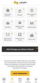 Auch das Mitteilungsblatt („Mehr“ -> „Mitteilungsblatt“) finden Sie nun in der App - zum direkten Anschauen auf Ihrem Mobilgerät. Neben einer Übersicht über die „Verwaltung“ können sich zudem alle Firmen, Vereine oder Institutionen unserer Mitgliedsgemeinden selbst vorstellen – von der Gastwirtschaft und dem, über den Frisörbetrieb und die KFZ-Werkstatt bis hin zur Wählervereinigung oder dem Elternbeirat. Der Basiseintrag ist kostenlos; es ist nur eine kurze Registrierung notwendig. (Zulieferer des Mitteilungsblattes, die sich bereits beim Redaktionssystem des Mitteilungsblattes registriert haben, können diesen Zugang nutzen und müssen sich nicht erneut registrieren!)