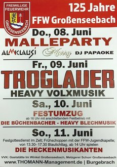 Die Gemeinde Großenseebach, vertreten durch die beiden Bürgermeister und den Gemeinderat laden alle Bürger*innen recht herzlich zum großen Festwochenende anlässlich der (nachgeholten) 125-Jahr-Feier unserer Freiwilligen Feuerwehr ein. Die Kamerad*innen haben ein umfangreiches Programm auf die Beine gestellt, bei dem für alle etwas dabei ist - egal, ob Groß oder Klein. Wir gratulieren unserer Wehr recht herzlich zum Jubiläum und wünschen allen viel Spaß auf den Veranstaltungen! Details zu den Veranstaltungen der einzelnen Tage finden Sie auch auf der Gemeinde-Homepage und in der Bürger-App.