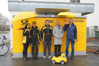 Das Regenwetter konnte die Freude über die neue, moderne Poststation in Großenseebach nicht trü-ben. Weder bei den DHL-Mitarbeitern Bianca Nahrhaft, Claudia Lindner, Markus Ehm noch bei den Bürgermeistern Jürgen Jäkel und Rudi Riedel (v.l.)