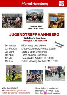 Der Jugendtreff Hannberg bietet ab Januar wieder einmal im Monat ein attraktives Angebot für Jugendliche von 12 bis 17 Jahren an, bei der jeder unabhängig von Konfession oder Religion willkommen ist. Zum Teil ist eine Anmeldung wünschenswert, alle Infos und spezielle Flyer werden zum Program werden über Instagram „pfarrei_hannberg“ publiziert.