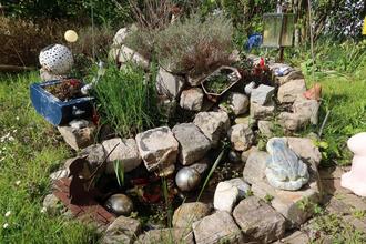 Eine Kräuterspirale mit Teich bauen: Am nördlichen Ende der Spirale einfach einen Bottich oder großen Baueimer eingraben oder ein Loch mit Folie auslegen. Den Teich mit etwas Sand befüllen und dann mit Wasser.
