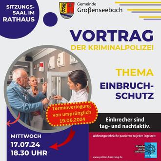 In Zusammenarbeit mit der Kriminalpolizei Erlangen bietet die Gemeinde Großenseebach auch im Juli eine Informationsveranstaltung mit Vortrag an. Ziel ist es, insbesondere Senioren über Einbruchsschutz zu informieren und ihnen effektive Schutzmaßnahmen aufzuzeigen. Zu diesen Veranstaltungen sind alle interessierten Bürgerinnen und Bürger recht herzlich eingeladen.