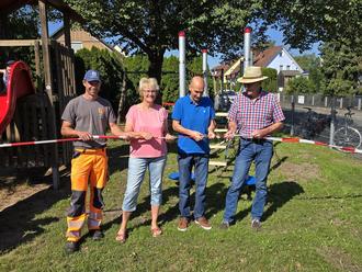 Anfang August eröffneten Bauhof-Chef Robert Schäfer, Gemeinderätin Heike Weiser und die Bürgermeister Jürgen Jäkel und Rudi Riedel (v.l.n.r.) den sanierten und erweiterten Spielplatz Hutweg..