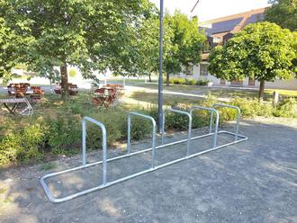 Mitarbeiter des Bauhofes haben den alten, verbogenen Fahrradständer („Felgenkiller“) neben der Gaststätte „Im Winkel“ durch einen neuwertigen, modernen Fahrradständer ersetzt.