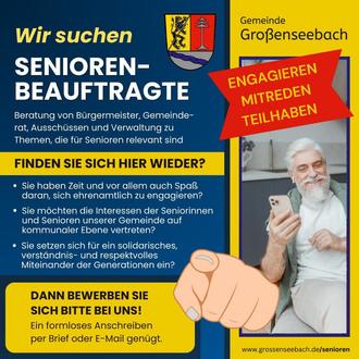 Wir suchen daher Einwohner aus Großenseebach, die 60 Jahre und älter sind sowie Spaß daran haben, sich ehrenamtlich zu engagieren. Sie sollten Interesse daran haben, die Seniorinnen und Senioren unserer Gemeinde auf kommunaler Ebene zu vertreten. Dafür setzen sich Sie sich mit Rat und Tat für die Interessen und Belange der älteren Bürger unserer Gemeinde ein.