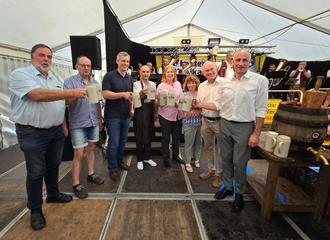 Ehrengäste beim Anstich: Weisendorfs Bürgermeister Karl-Heinz Hertlein, Zweiter BGM Rudi Riedel, MdL Christian Zwanziger, Erster BGM Jürgen Jäkel, Bundestagspräsidentin Bärbel Bas, MdB Martina Stamm-Fibich, stv. Landrat Dr. Martin Oberle und Bauerei-Chef Georg Hofmann (v.l.)