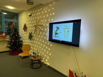 In einem weihnachtlichem Ambiente liefen auf einem Bildschirm die passenden Bilder aus dem Buch zur Geschichte.