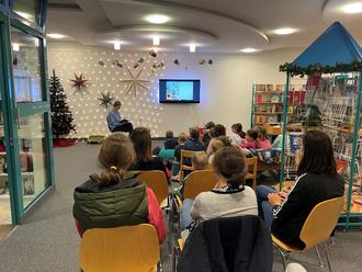 Die kleineren Zuhörer lauschten der Geschichte von "Räuber Hotzenplotz und die Mondrakete" von Otfried Preußler. Auf einem großen Bildschirm konnten die Kinder zur Geschichte die Bilder verfolgen und sich die Geschichte so noch lebhafter vorstellen.