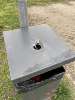 Abfallbehälter für Kippen auf dem Parkplatz gegenüber dem Großenseebacher Friedhof