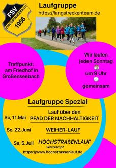 Wir laufen immer sonntags um 9:00 Uhr. Treffpunkt: Parkplatz am Friedhof. Vor Ort wird entschieden, welche der vielen schönen Strecken im Seebachgrund gelaufen wird. Weitere Laufzeiten sind Dienstag (9:00 Uhr oder 18:30 Uhr nach Absprache) und Donnerstag um 9:00 Uhr. Wir freuen uns über alle Laufbegeisterten und über diejenigen, die es werden möchten. Infos rund um den Laufsport, vom Einstieg bis zum Wettkampf, vom optimalen Laufschuh bis zur richtigen Ernährung gibt es auch bei uns.