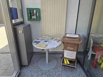 Im Foyer des neuen Bürgerbüros (ehem. Sparkasse) unserer Verwaltung finden Sie nicht nur den Bücher- und Spieletauschschrank, sondern auch einen sogenannten automatisierten externen Defibrillator (AED) – kurz „Defi“ für medizinische Notfälle – sowie die Tonne mit den Gelben Säcken. Alle diese Angebote sind aufgrund der automatischen Schiebetür für das Foyer rund um die Uhr für unsere Bürgerinnen und Bürger zugänglich.