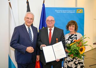Bayerns Innenminister Joachim Herrmann hat in Erlangen das Verdienstkreuz am Bande des Verdienstordens der Bundesrepublik Deutschland an den Heßdorfer Reinhard Lugschi (Mitte) ausgehändigt.