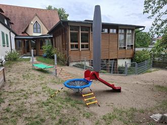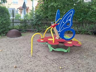 Der gemeindliche Bauhof hat das alte Spielhaus entfernt und im Juli durch ein altersgerechtes Spielgerät („Schmetterling“) ersetzt. Außerdem platzierten die Mitarbeiter im Hang des Gartens eine Kletterkombination nebst Nestrutsche und Beschattung durch einen Sonnenschirm sowie Fallschutzmatten. Für die Spielgeräte hat die Gemeinde ca. 26.000 Euro investiert. Während der Sommerpause hat nun der frisch angesäte Rasen Zeit zum Wachsen, damit die neuen Geräte zum Beginn des neuen Kindergartenjahres im September ausführlich bespielt werden können.