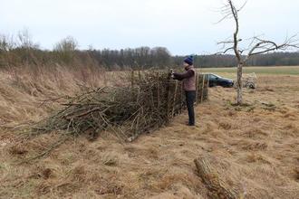 - größere Äste abschneiden und kleinere, längere Äste zwischen den Pfählen einflechten; dies stabilisiert zusätzlich