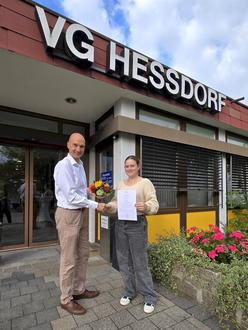 VG-Vorsitzender Jürgen Jäkel gratulierte der ehemaligen Auszubildenden persönlich zum erfolgreichen Abschluss. „Sie haben in den vergangenen drei Jahren hart für diesen Abschluss gearbeitet und ihn nun geschafft. Ich freue mich sehr, dass wir Sie - jetzt als Verwaltungsfachangestellte - weiter in unserem Team haben“ beglückwünschte der Verwaltungschef die Membacherin zur bestandenen Abschlussprüfung und wünschte ihr viel Erfolg für ihren weiteren Berufsweg.