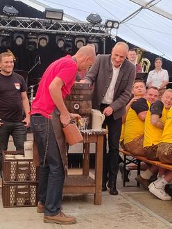 Schon nach zwei Schlägen floss das erste frische Festbier, das an die Gäste ausgeschenkt wurde. Begleitet von fröhlichen „Prosit“-Rufen und dem Klang der Musik, stieß man gemeinsam auf eine gelungene Kerwa an.
